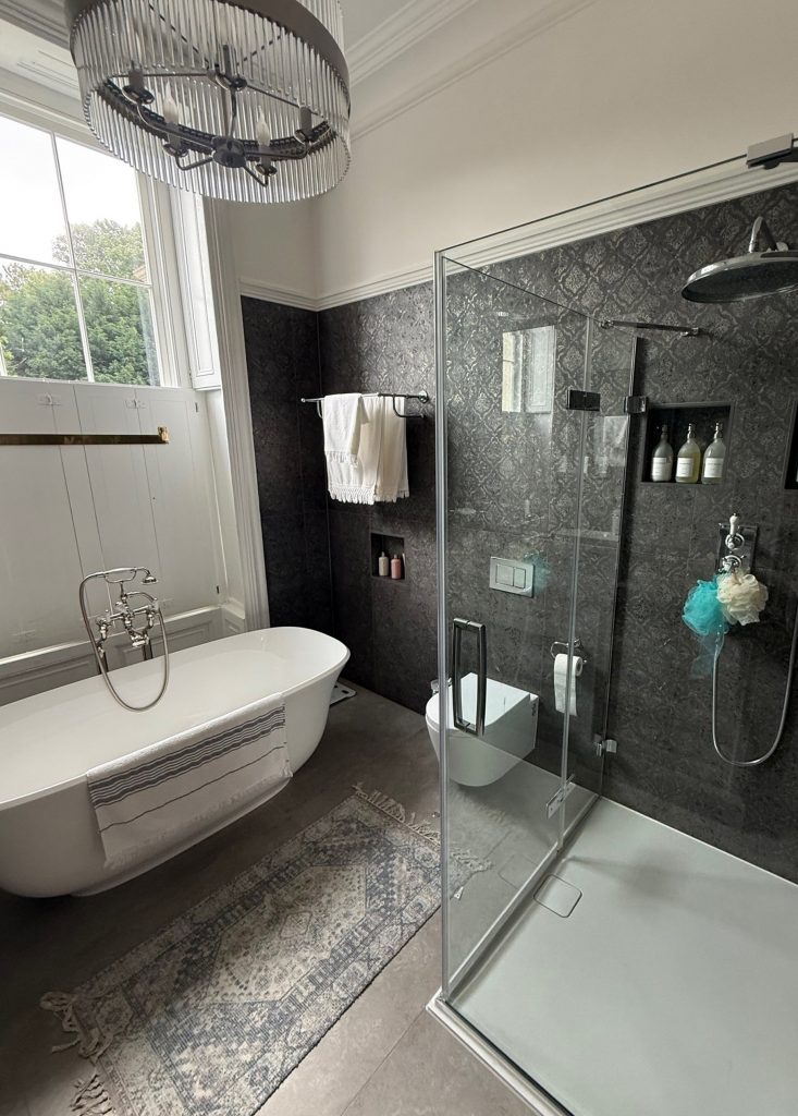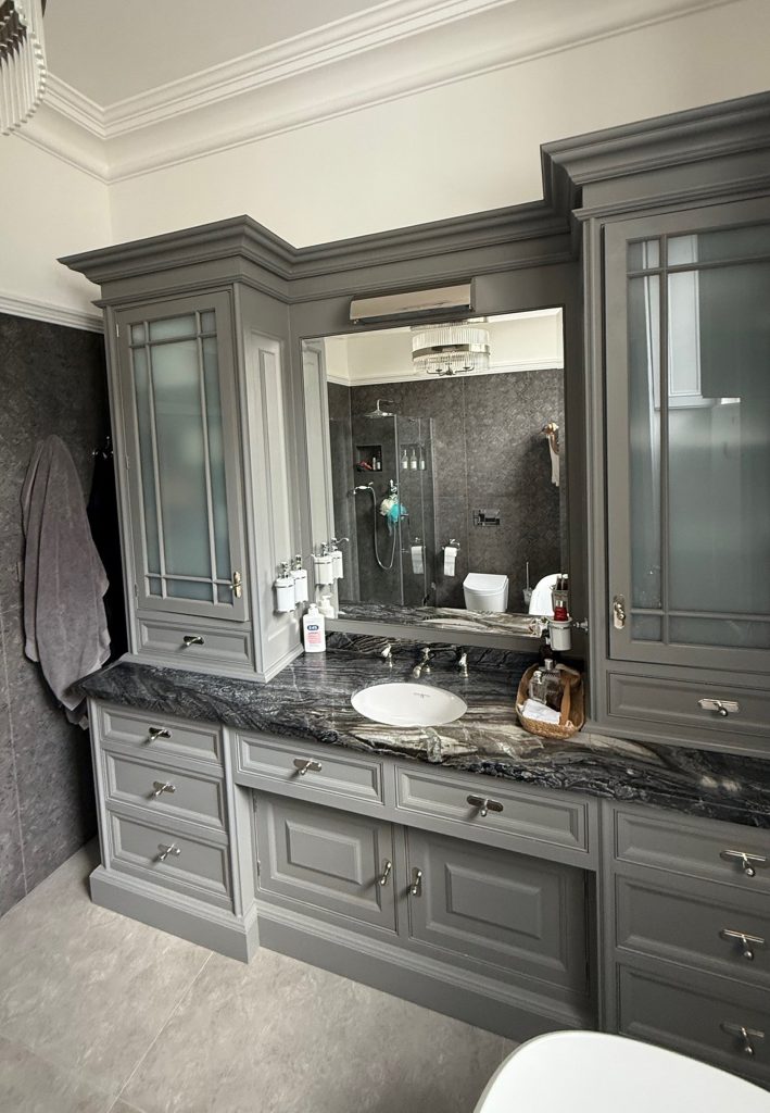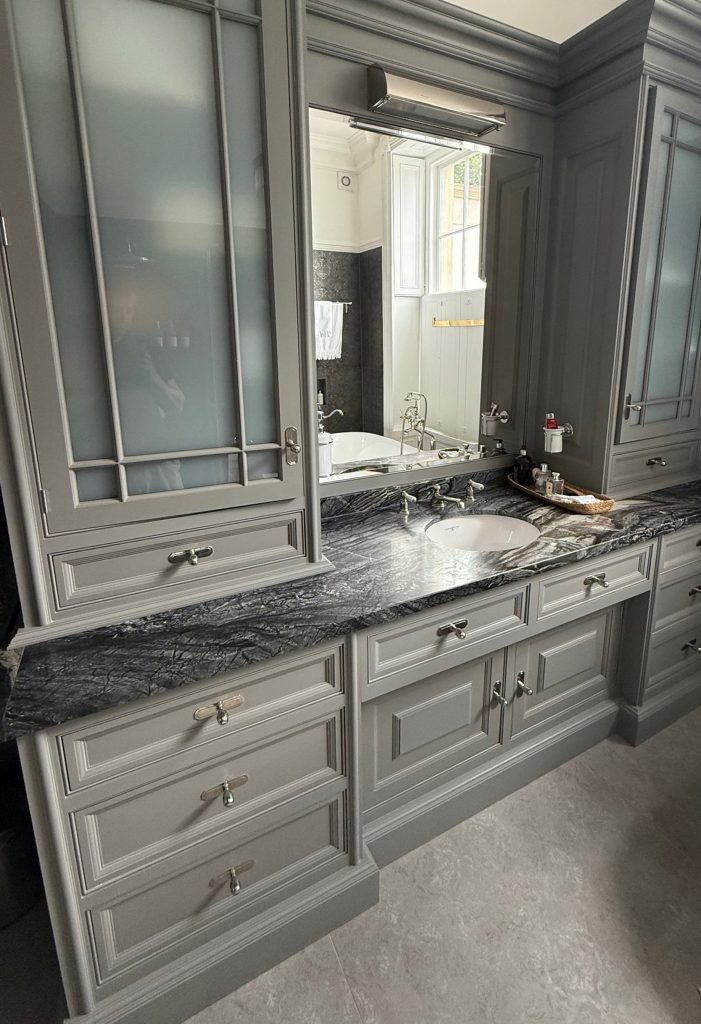 I chose a muted grey palette to evoke calmness and depth, complementing traditional Georgian architectural elements like panelled walls and classic moldings. High quality materials like marble countertops and polished chrome fixtures add refined texture and understated luxury. Every detail, from the vintage inspired taps to the bespoke cabinetry, was thoughtfully integrated to honor the era’s heritage while ensuring contemporary comfort.