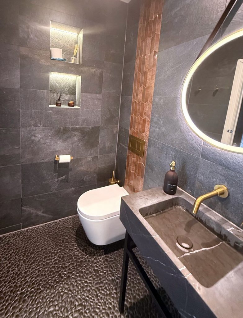 When planning and designing the bathroom layout, I started by considering both functionality and aesthetic harmony. The goal was to create a space that feels sophisticated whilst balancing clean lines with warm textures.